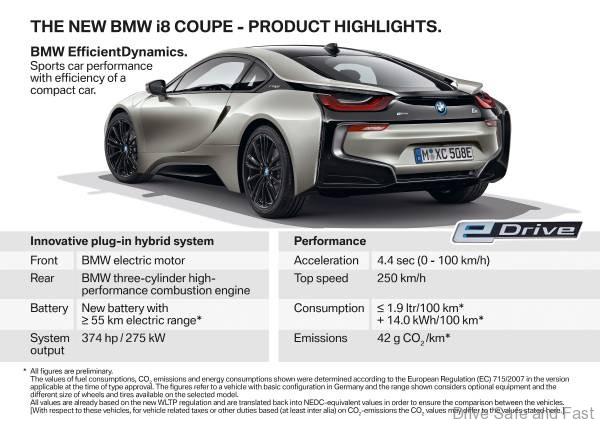 Enhanced dynamics and markedly increased scope for locally emission-free driving. Driving with the electric motor alone is possible at up to 105 km/h (previously 70 km/h). Pressing the eDrive button pushes the pure-electric driving threshold up to 120 km/h. Electric range: 53 kilometres (BMW i8 Roadster), 55 kilometres (BMW i8 Coupe).
