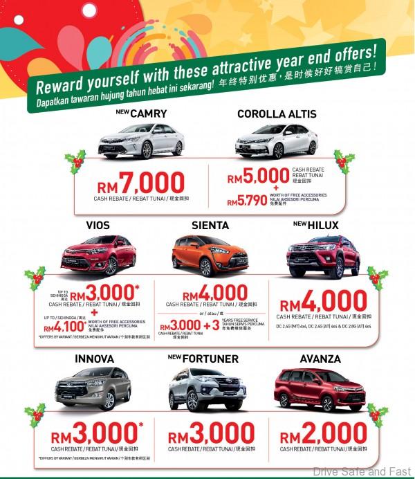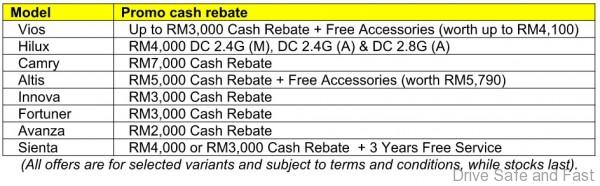 Cash rebates of up to RM7,000 are available for the Vios, Corolla Altis, Avanza, Sienta, Innova, Camry, Hilux and Fortuner.