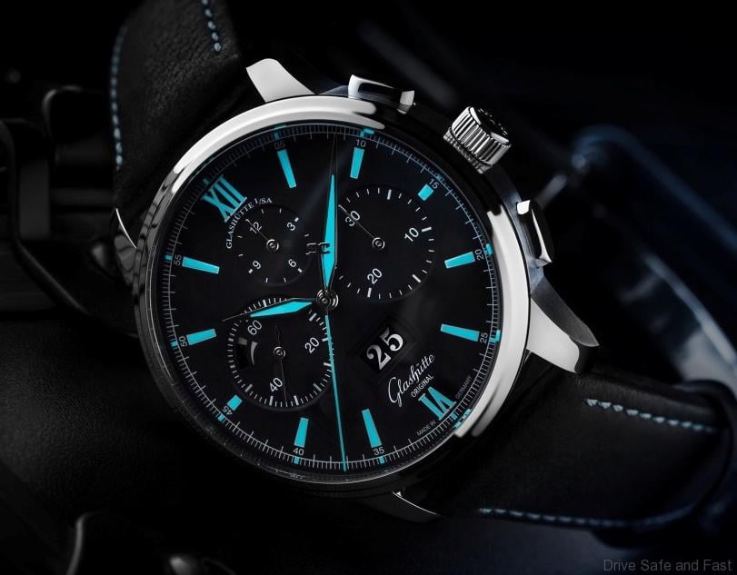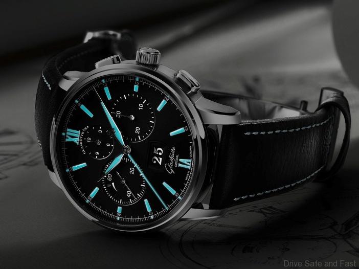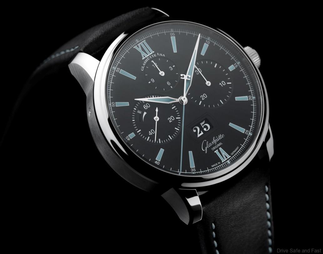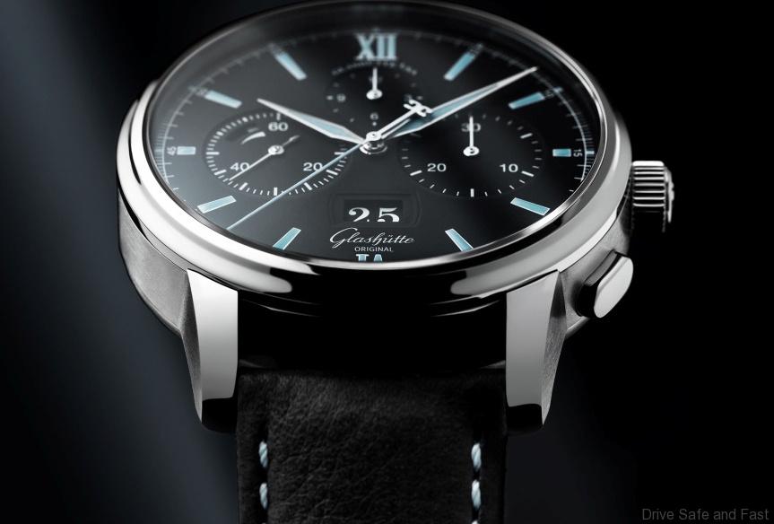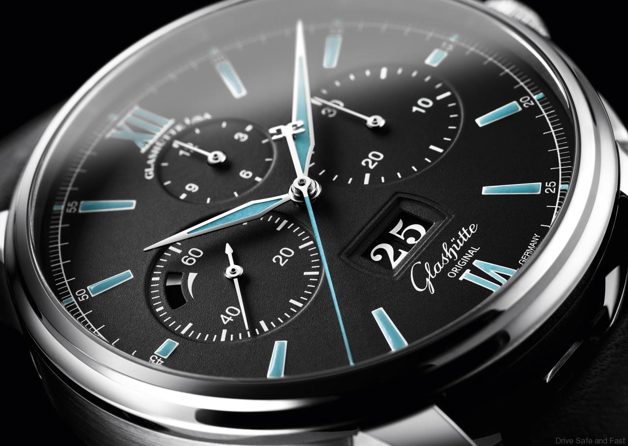 Its alluring deep black dial is set off by high-contrast white print and enhanced by the generous use of radiant blue Super-LumiNova, which highlights the white gold hour, minute and stop seconds hands, Roman numerals at hours 6 and 12 and all hour indexes, permitting excellent legibility even in the dark. Glashütte Original’s unique Panorama Date window is positioned centrally in the lower half of the dial beneath the upper-half triad formed by 30-minute and 12-hour chronograph counters and the small seconds display, in which the power reserve display is charmingly integrated.