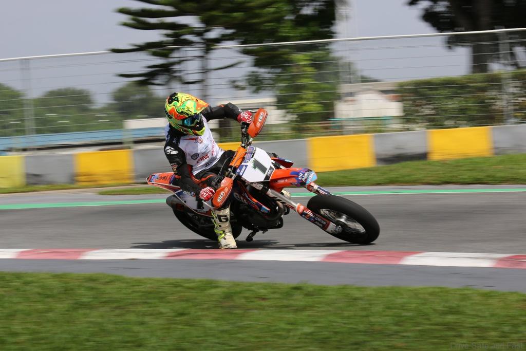 A notable action was spotted by Khairi Zakaria as he applies the ‘knee-out’ technique instead of the ‘leg-out’ technique usually practised by SuperMoto riders.