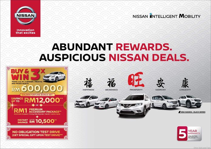 Additionally, customers can enjoy impressive Golden Fortune Bonus Set on selected NISSAN models with options comprising of savings up to RM12,000 or RM1.00 promotion for premium accessory package and rebates of up to RM10,500.