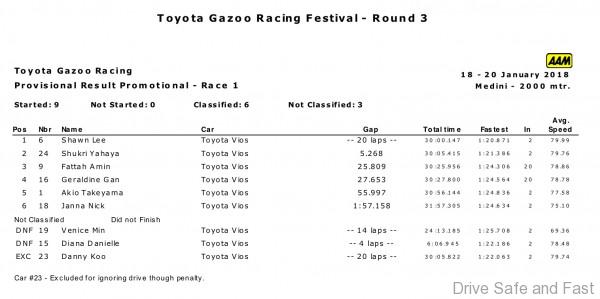 Meanwhile, Janna Nick was in great form and she passed Fattah to claim third, he highest position so far. Unbeknownst to them, Danny Koo who was ahead was slapped with a drive through penalty for his incident with Diana but as he missed the window to pull in for the penalty, he would be excluded from the race results.