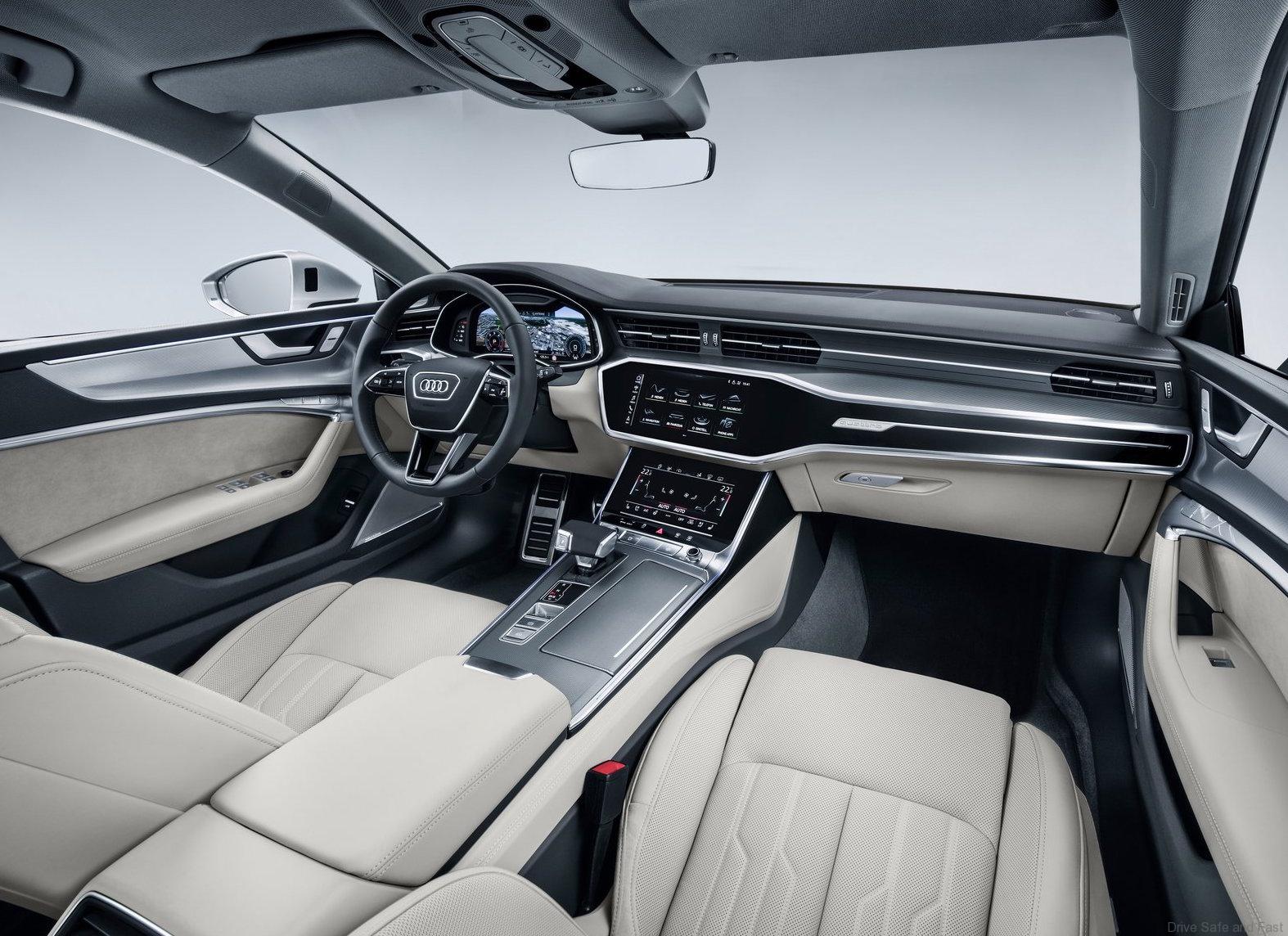 The design language in the interior of the new Audi A7 Sportback is reduced and clean. The horizontal lines and sleek instrument panel convey a feeling of airy spaciousness. The center console is inclined toward the driver and underscores the Gran Turismo’s sporty character. In the interior, the cockpit architecture and the MMI monitor merge to form a homogeneous surface. Most vehicle functions can be controlled via two displays in a black-panel look. The upper display is integrated almost invisibly into the dashboard. The choice of colors, upholstery materials, inlays and interior lighting fit perfectly into the futuristic lounge atmosphere.