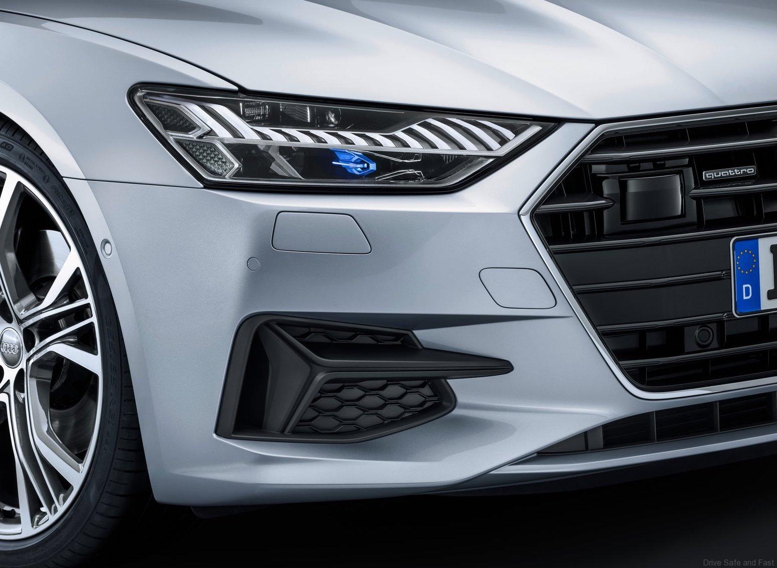 The exterior design of the new Audi A7 Sportback emphatically embodies Audi’s new, progressive design language focused on large surfaces, sharp edges and alternating light and shadows. The wide, low Singleframe grille and prominent air inlets express the dynamic character of the Gran Turismo at first glance. With the two optional headlight variants, twelve separate horizontal lighting strips create the lighting signature. Topping the line are the HD Matrix LED headlights with Audi laser light, which can be recognized by the blue marker in the reflector.