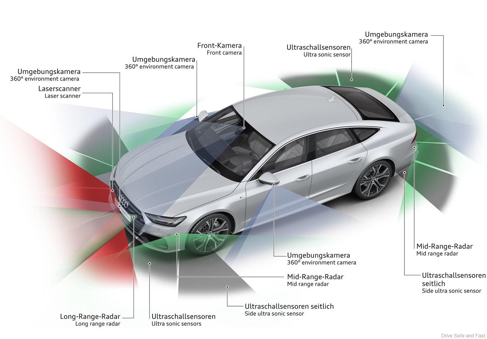 Like the A8, the new Audi A7 Sportback is equipped with the central driver assistance controller (zFAS), which continually computes an image of the surroundings. It draws on a sensor set that in the full version includes five radar sensors, a laser scanner, a front camera, four 360 degree cameras and twelve ultrasonic sensors. The Audi (remote) parking pilot and Audi remote garage pilot, which will follow in the course of the year, automatically steer the Gran Turismo into a parking space or garage and back out again when the driver activates and monitors this function on their smartphone. The driver can also activate the Audi parking pilot via the corresponding button.