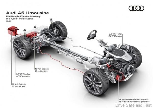 All engines in the new A6 come with Audi’s new mild-hybrid technology. Here a belt alternator starter (BAS) works together with a lithium-ion battery. The Audi A6 can coast between 55 and 160 km/h.