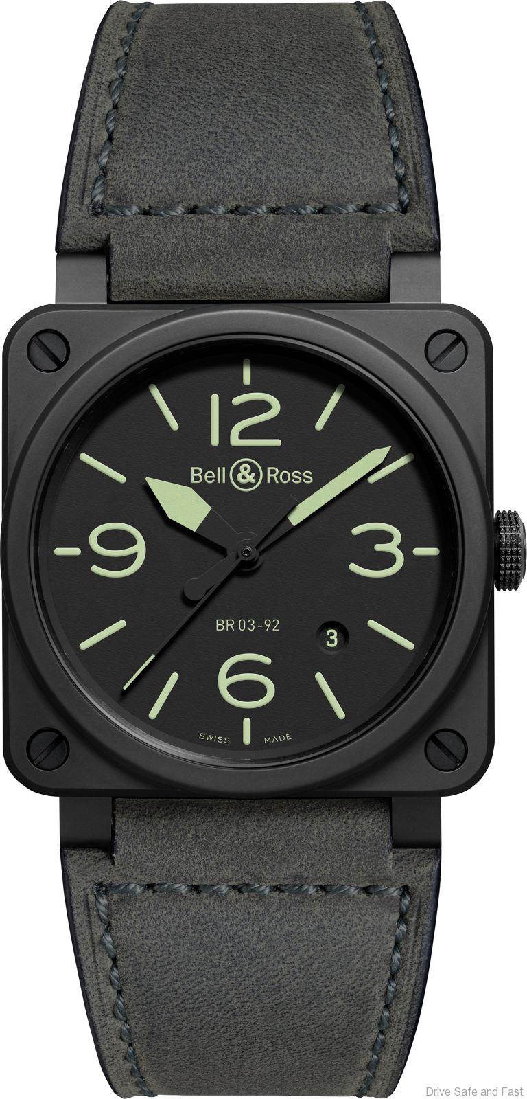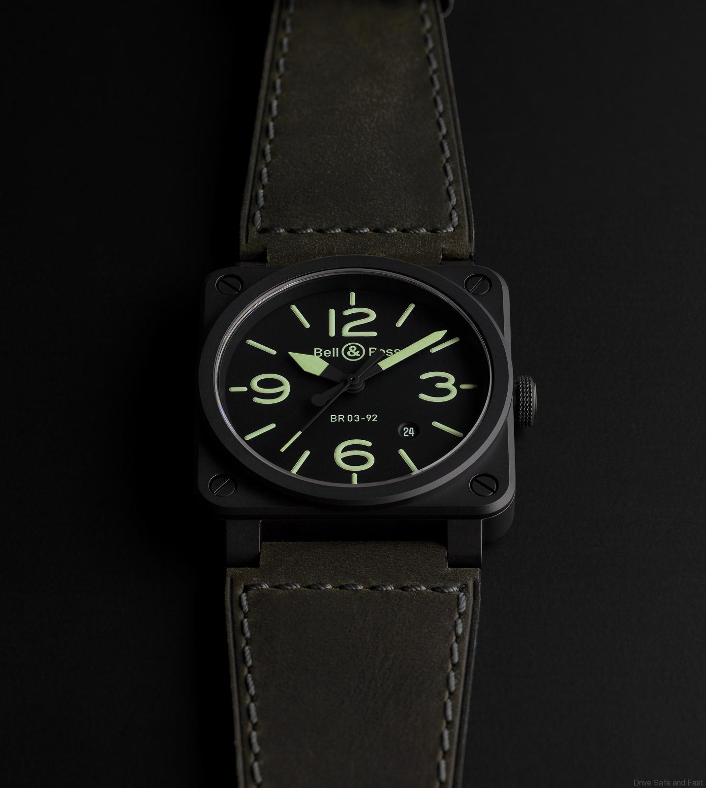 The minimalist design of the BR03-92, with its black matte ceramic case, ultra- phosphorescent green numbers and grey-green lambskin strap will seduce every pilot watch lover.