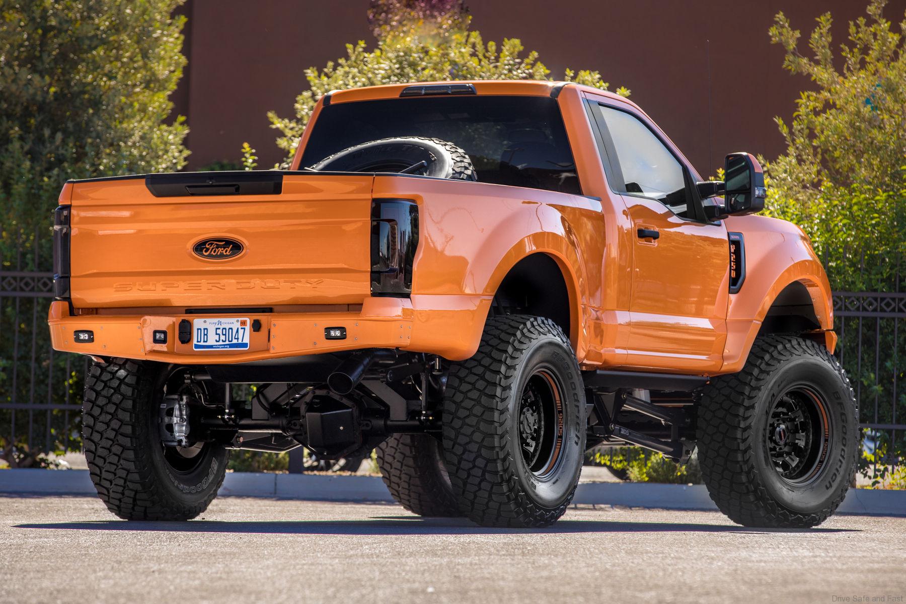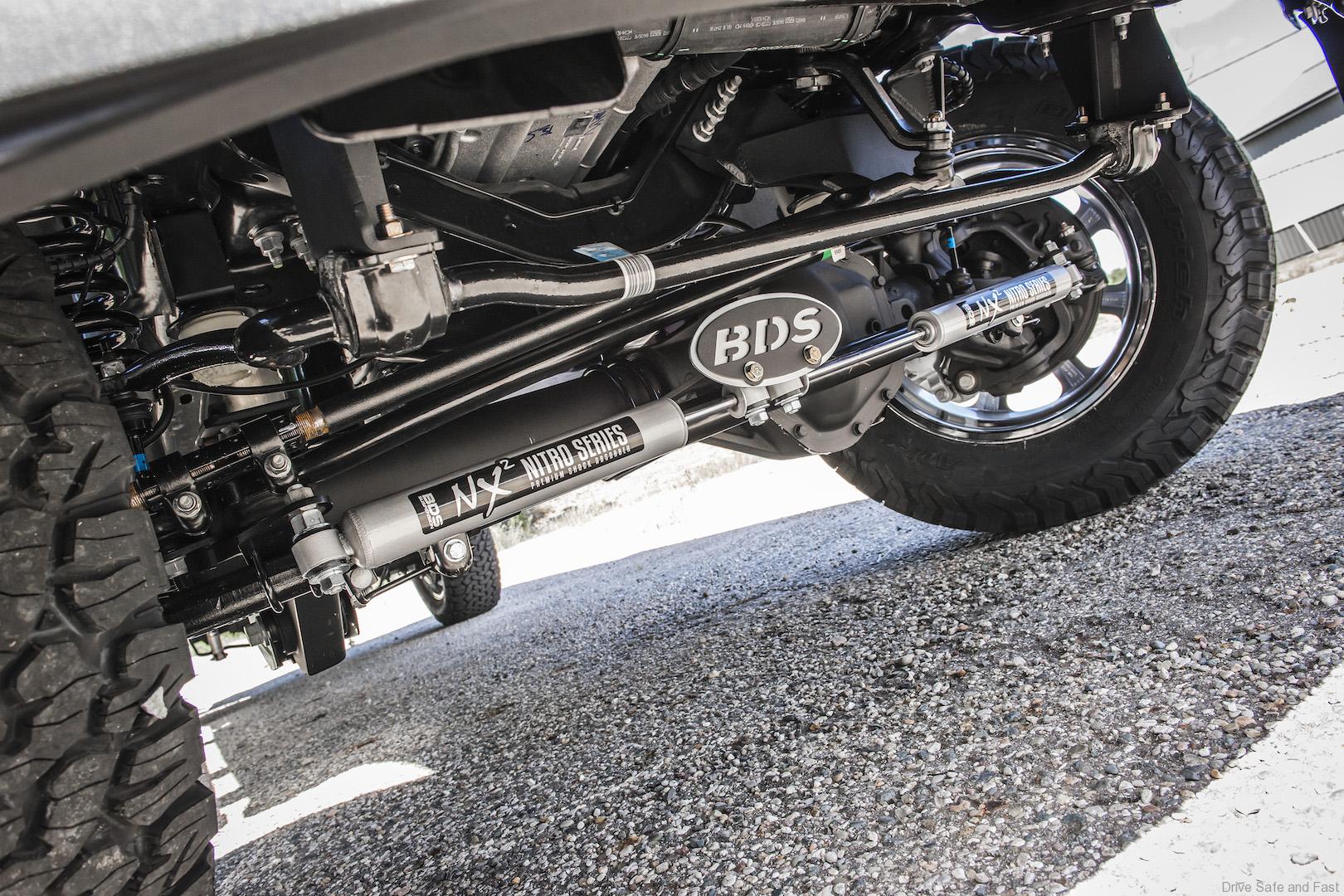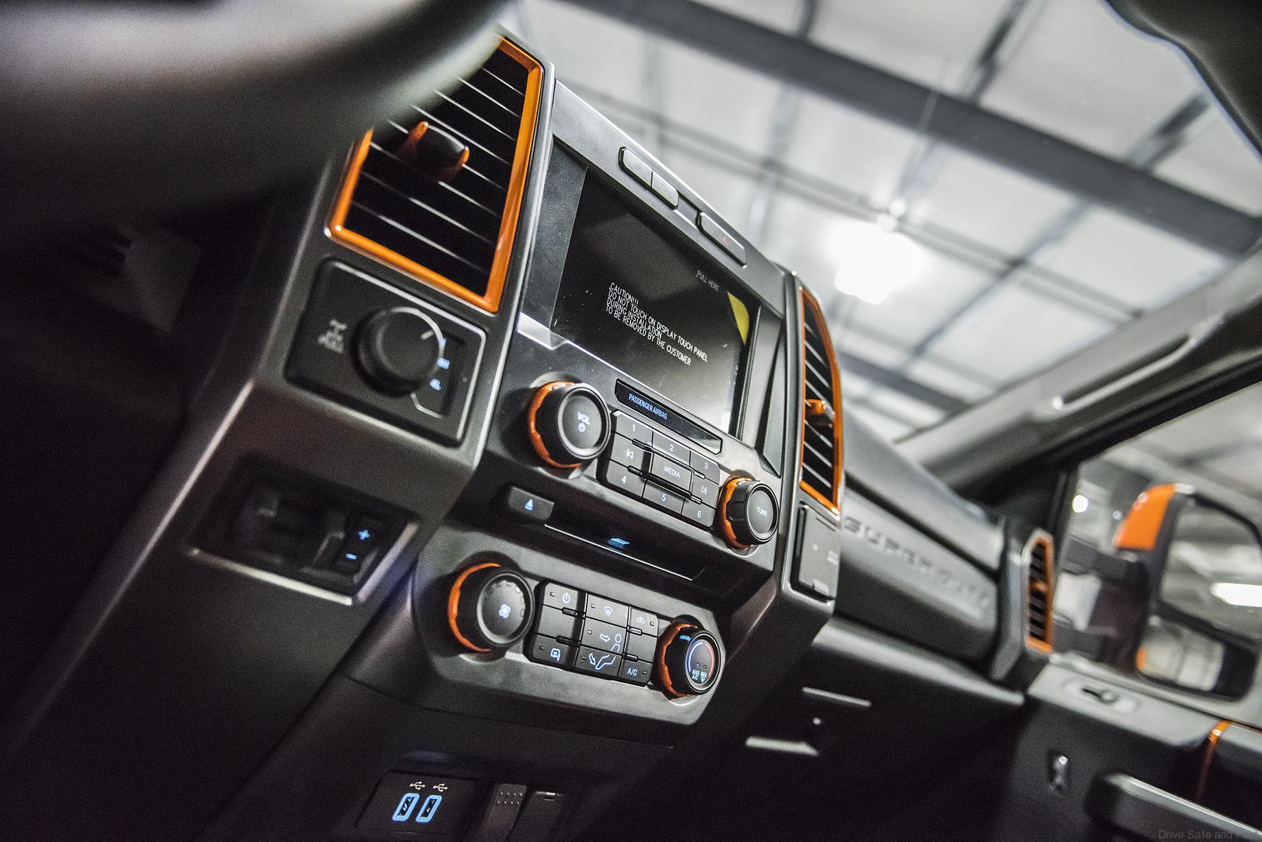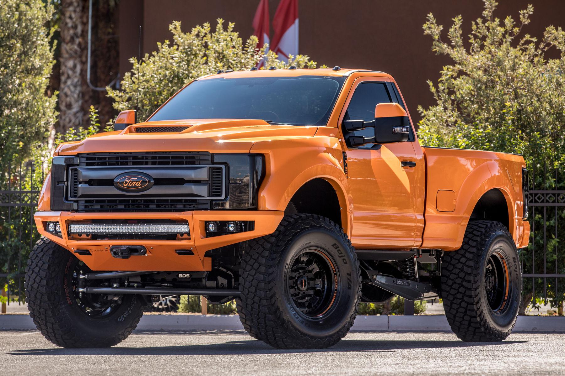 But that’s not all that’s been done to the body. BDS Suspension’s Ford F-250 off-roader build features front and rear bumpers from Rogue Racing, AMP Research powersteps, and a ram air hood from RK Sport. The truck is equipped with a Warn Zeon 12-S winch with a Factor 55 FlatLink, and up front, a 40-inch RDS lightbar from Rigid Industries is mounted, flanked by Rigid amber radiance pods. The entire body is shod in stunning PPG orange metallic paint by Butler Body Shop.