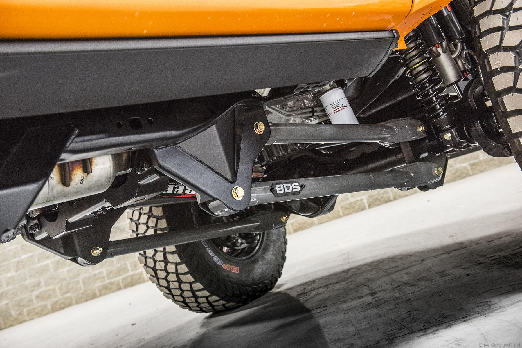 There’s been plenty more done to the suspension, where BDS Suspension has performed a four-link front conversion and a rear trailing arm conversion. Fox 2.5 DSC (Dual-Speed Compression) coilovers with 3.0 external bypass dampers, featuring 14 inches of travel, have been fitted to all four corners. The coil springs, as well as the sway bar, come from Pac Racing, and the bump stops switched out for Fox 2.0 IFP units.