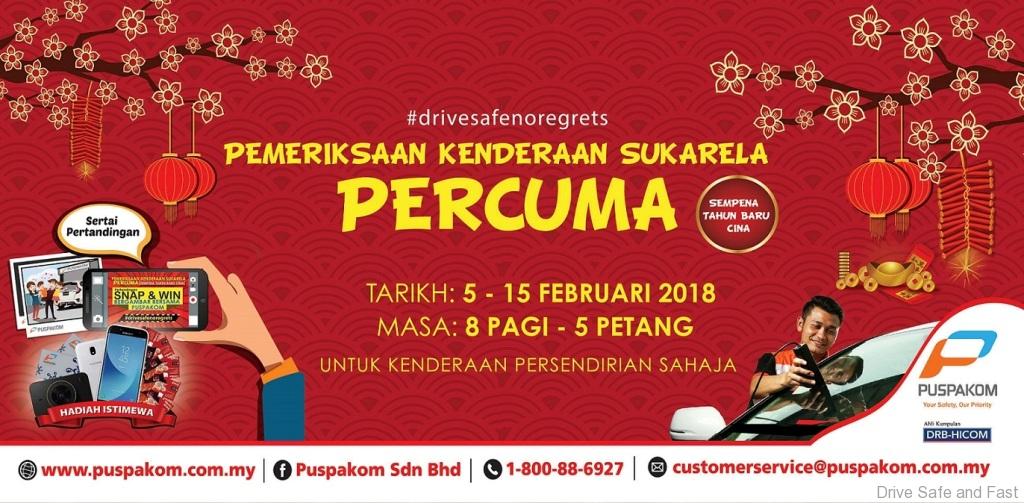 In conjunction with this upcoming Chinese New Year, Puspakom is offering #drivesafenoregrets free Voluntary Vehicle Inspection for private vehicle owners from 5 to 15 February 2018, 8 a.m. to 5 p.m. at all inspection centres nationwide; except Shah Alam, Taman Bukit Maluri, Mak Mandin, Kota Bharu, Langkawi, Labuan dan Lahad Datu.