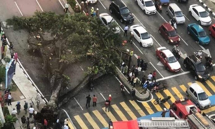 A giant tree has fallen at an intersection near Public Bank and KLCC.