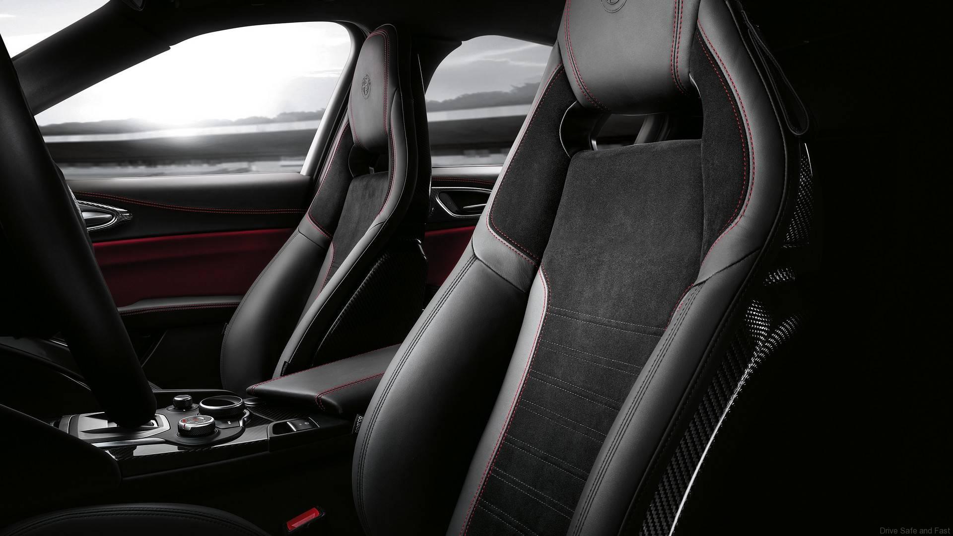 In addition to the features of excellence that characterise all Quadrifoglio cars, standard equipment on the “NRING” special series includes carbon-ceramic brakes, Sparco racing seats with red stitching and carbon shell structure, Mopar® automatic transmission knob with carbon insert, leather and Alcantara steering wheel, also with carbon inserts. The front badge and the rearview mirror caps are made of carbon fibre, like the side skirt inserts. Not to mention tinted windows, active cruise control, the Harman Kardon premium audio package, and the AlfaTM Connect 3D Nav infotainment system with 8.8” screen, Apple CarPlayTM, Android AutoTM and DAB. Giulia premieres a new bare carbon roof.
