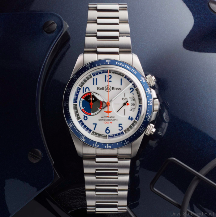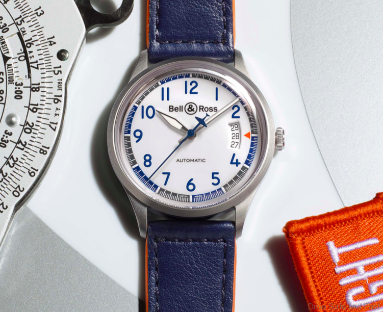 The dial is white, like the fuselage of the plane. The numerals, bezel, chronograph counter and strap are blue, like the empennage and decorative elements tracing the aerodynamic lines of the BR-Bird. The central second hand, details on the dial and lining of the leather strap are orange, like the color highlighting the most important information on the flight instruments. The timer is grey, reminiscent of the chequered flag used in speed competitions, like the Bell & Ross logo on the wings and flanks of the aircraft.