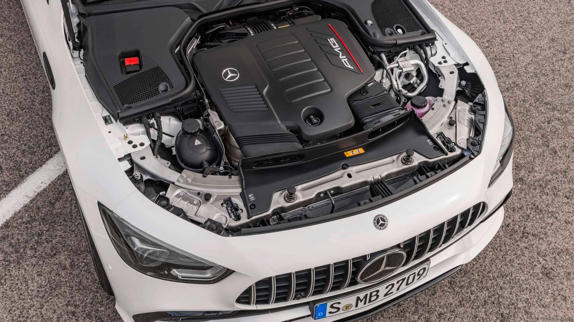 In the Mercedes-AMG GT63 4MATIC+ (fuel consumption combined 11.0 l/100 km, CO2 emissions combined 252 g/km) the V8 unit provides 430 kW (585 hp) and 800 Nm maximum torque. The sprint from standstill to 100 km/h lasts just 3.4 seconds, and the top speed is 310 km/h.