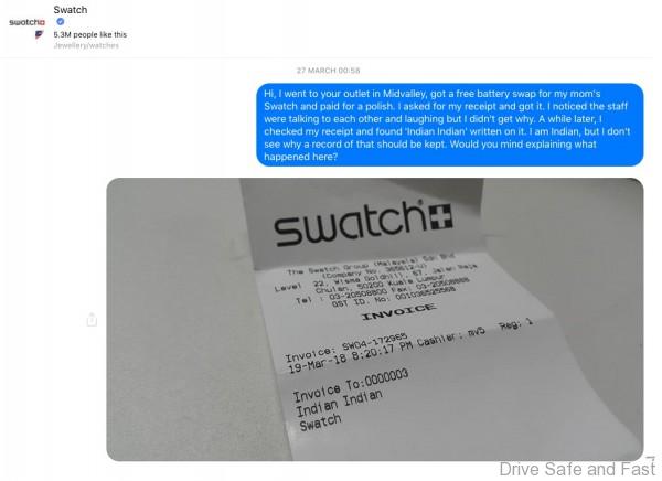 I was busy at the time, so, a week later, I sent a message on Facebook to Swatch Malaysia asking why ‘Indian Indian’ showed up on my receipt. Seems puzzling, right? Are they assuming the races of customers that walk in and officially listing it down? Is there any need to? Was this a practical joke by the cashier? If so, should I be personally offended?