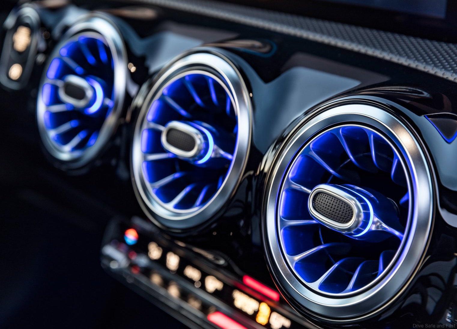 The interior architecture and the control & display systems of the new A-Class are an avant-garde USP in this segment. The dashboard is divided into two three-dimensional, horizontal sections: the lower section is visually separated from the main body of the dashboard by a “trench”, and it appears to float in front of the dashboard. The optional ambient lighting enhances this effect, accentuating the free-floating impression of the substructure.