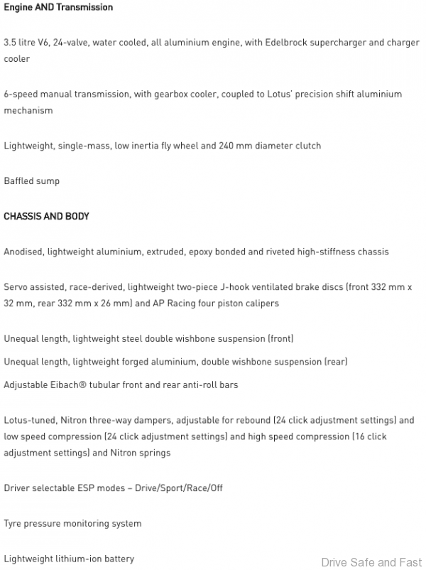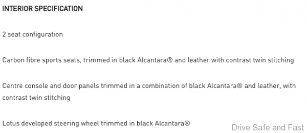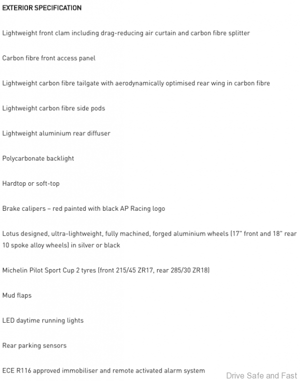 Working from Lotus’ standpoint as the leader in lightweight design, every gram has been justified, from the standard lightweight carbon front splitter and access panel at the front to the carbon side pods, tailgate and wing at the rear.