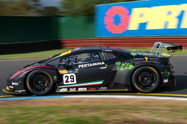 Race one saw the #29 Lamborghini just outside the top ten heading to the compulsory pit stop, where the team gambled with strategy, electing to leave him on wet weather tyres rather than lose time changing all four tyres, a strategy that would have paid off comfortably as many of the teams around him elected to change to slicks despite more threatening weather.
