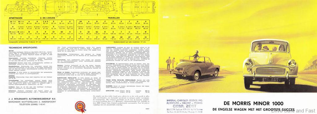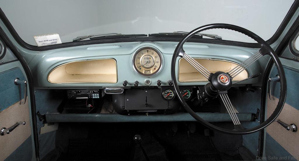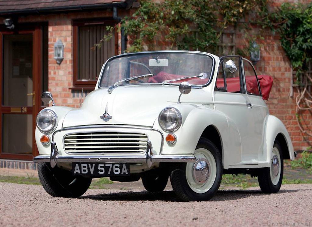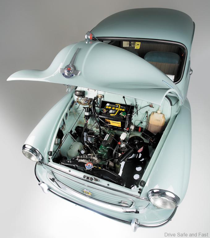 The Morris Minor 1000 was a 1956 update with the engine capacity increased to 948cc. This motor produced 37bhp and 68Nm of torque. It could reach 128km/h top speed with its kerb weight of just 788kg using a simple 4-speed manual gearbox. It was 3817mm long and 1524mm wide.
