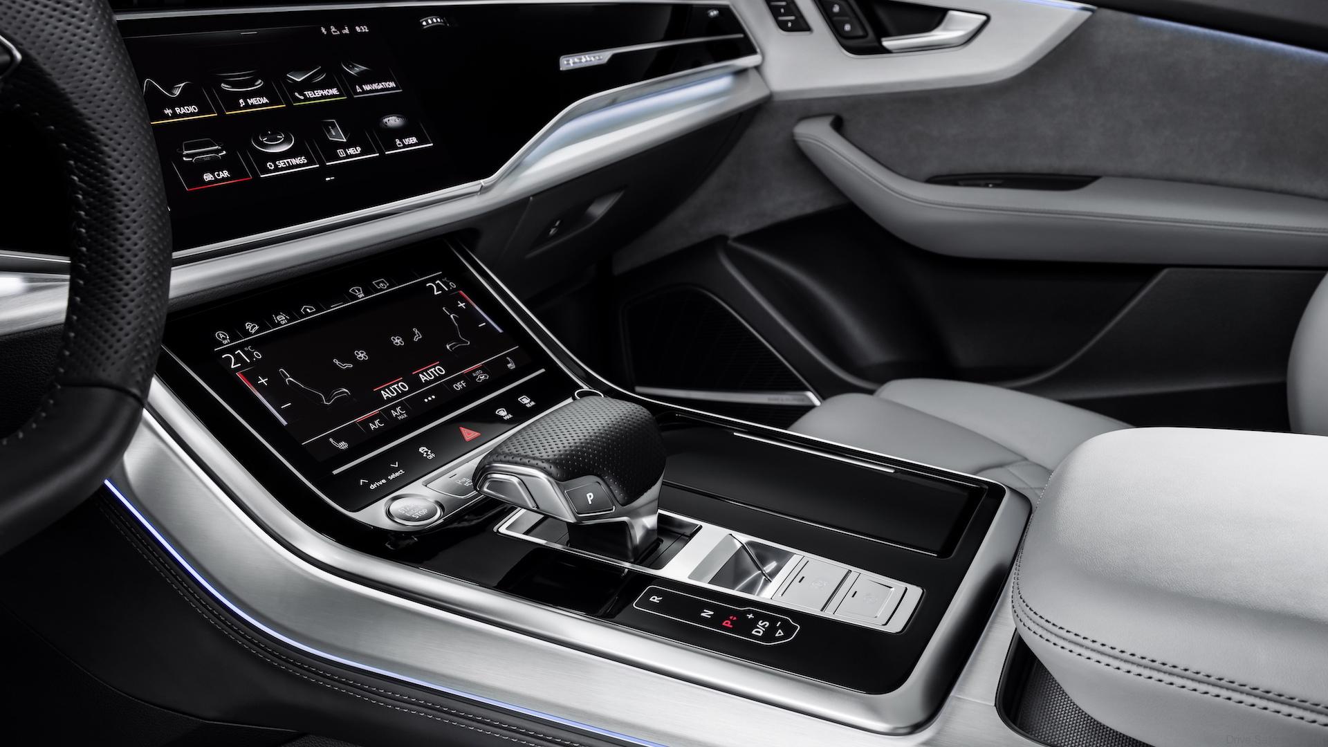 The operating concept in the Audi Q8 needs almost no buttons or knobs. It focuses on two high-resolution touch displays. This allows the brand to demonstrate how it transfers its uncompromising quality claim to the digital world. The upper display with 10.1 inch screen diagonal is used for controlling the infotainment and the navigation system. The lower 8.6 inch display allows the driver to manage the heating, ventilation and air conditioning as well as comfort functions and text input. The driver’s wrist can rest comfortably on the tiptronic selector lever during operation. The MMI touch response concept allows fast and reliable operation. A confirmation click can be felt and heard when a function is selected with a finger tap. The menu structure is intuitively logical and flat like on a smartphone, including freely configurable favorites and start screens.