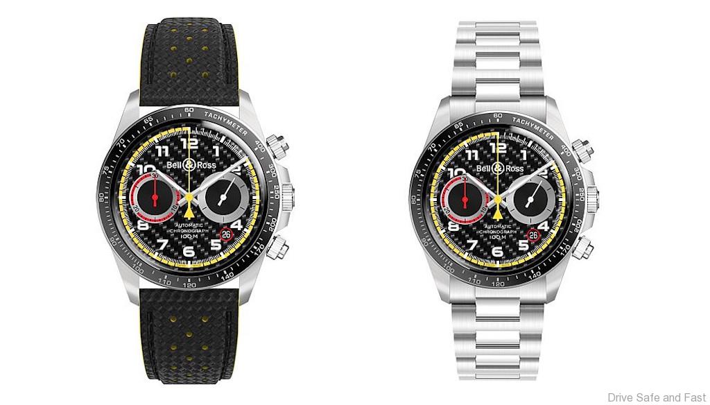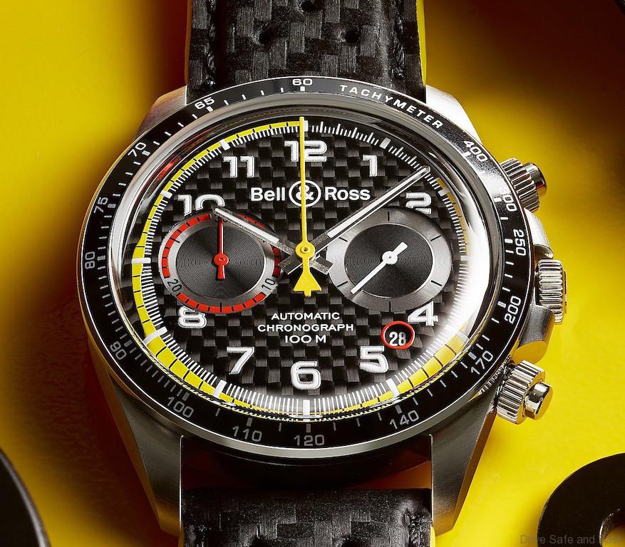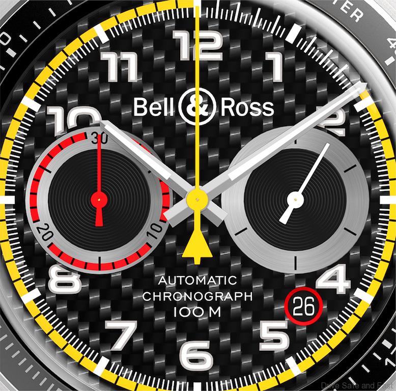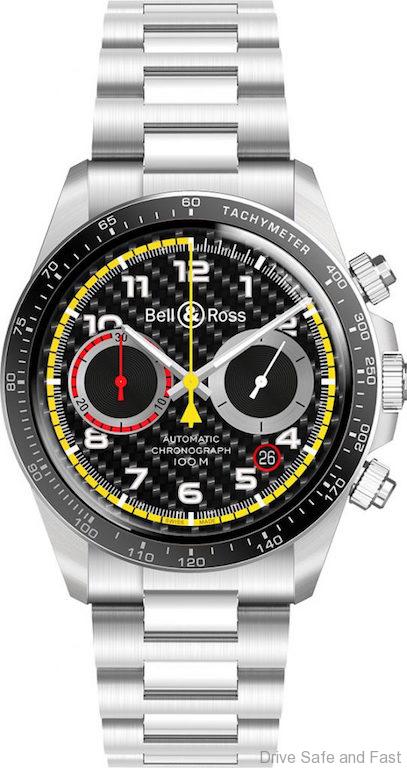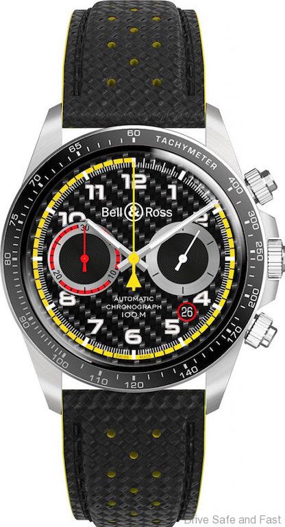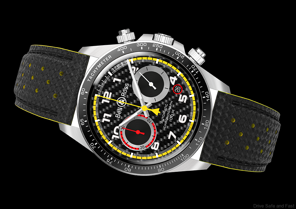 The Bell & Ross BR V2-94 R.S.18 has a yellow internal minute track and two counters, one in red for optimal legibility of the chronograph function. A tachymeter scale on the bezel allows a car’s speed to be instantly calculated over a given distance.