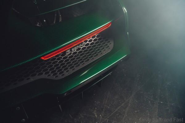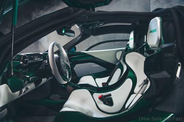 Blue and red wheel centre lock nuts and ball polished wheels complete the exterior, while the body colour is carried through to the interior, with “Fux Green” Tinted Carbon in Gloss Finish complemented by a bright white leather facia, seats, door uppers, and steering wheel, with green contrast stitching on the seats and steering wheel. The headliner remains in Carbon Black Alcantara®, while the door struts and rear-view mirror are painted in green.