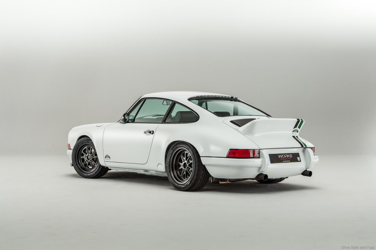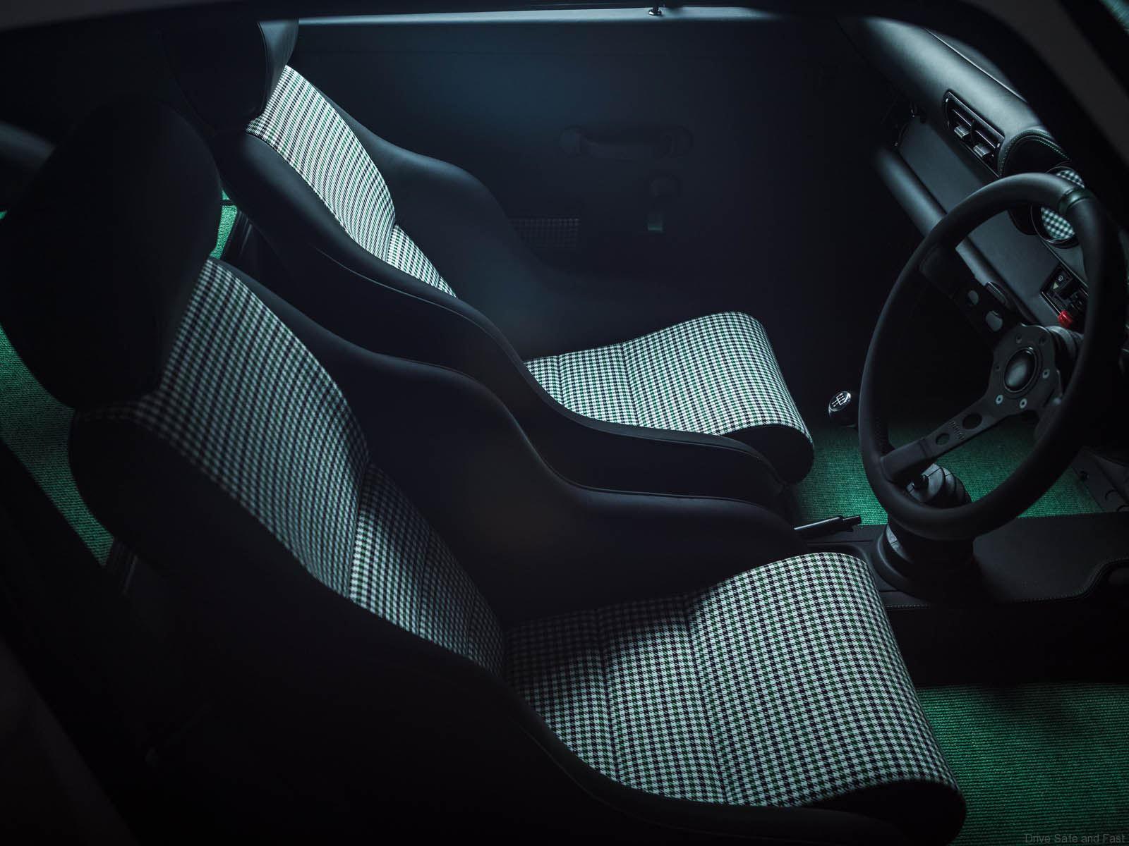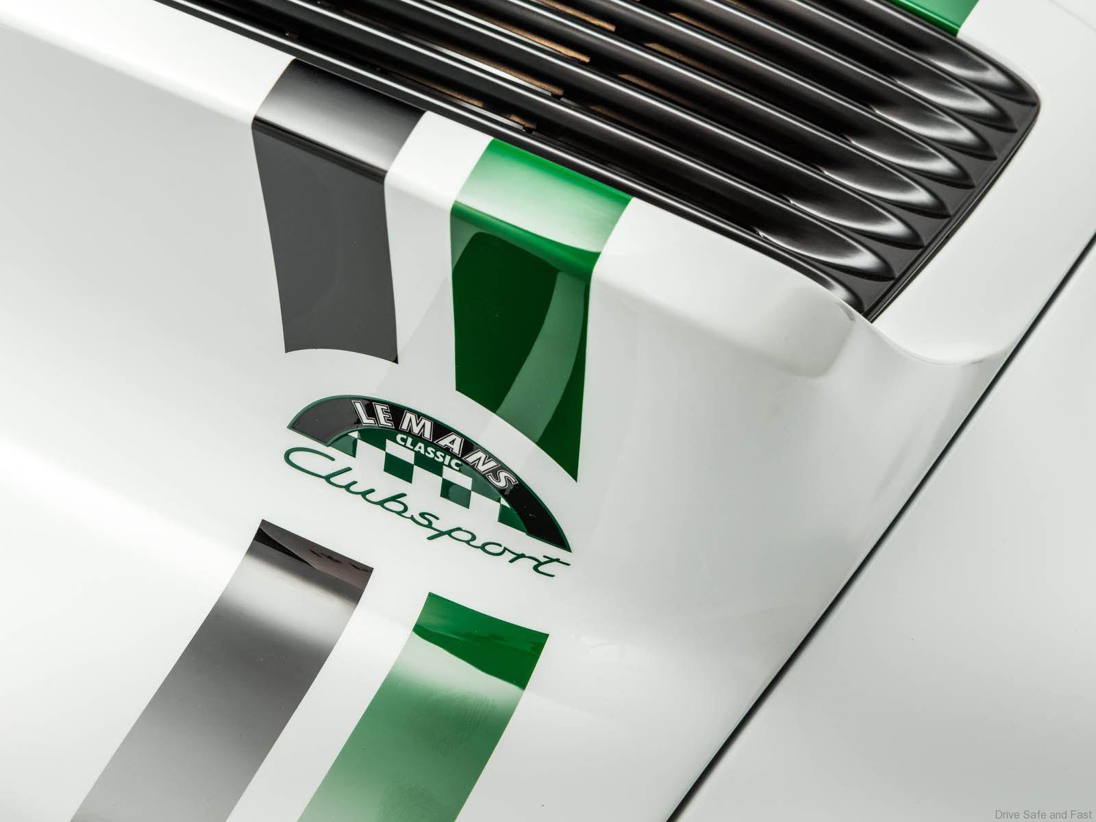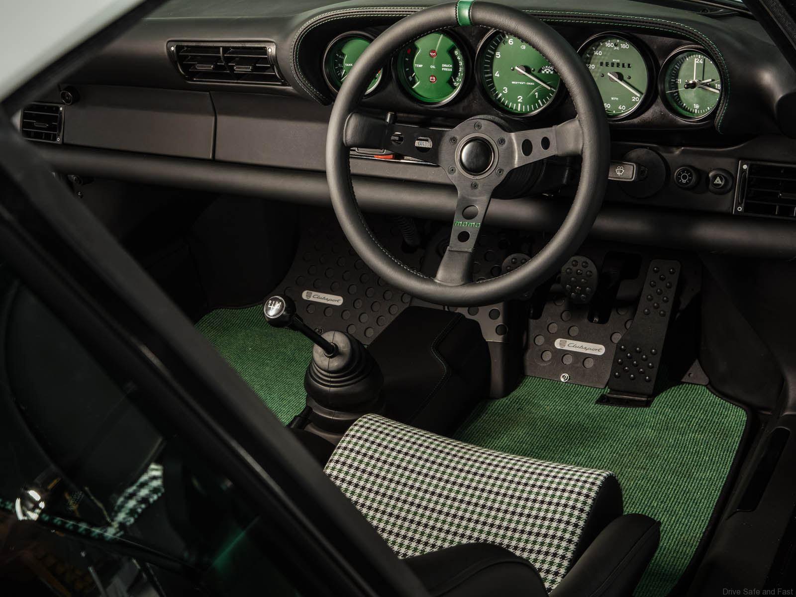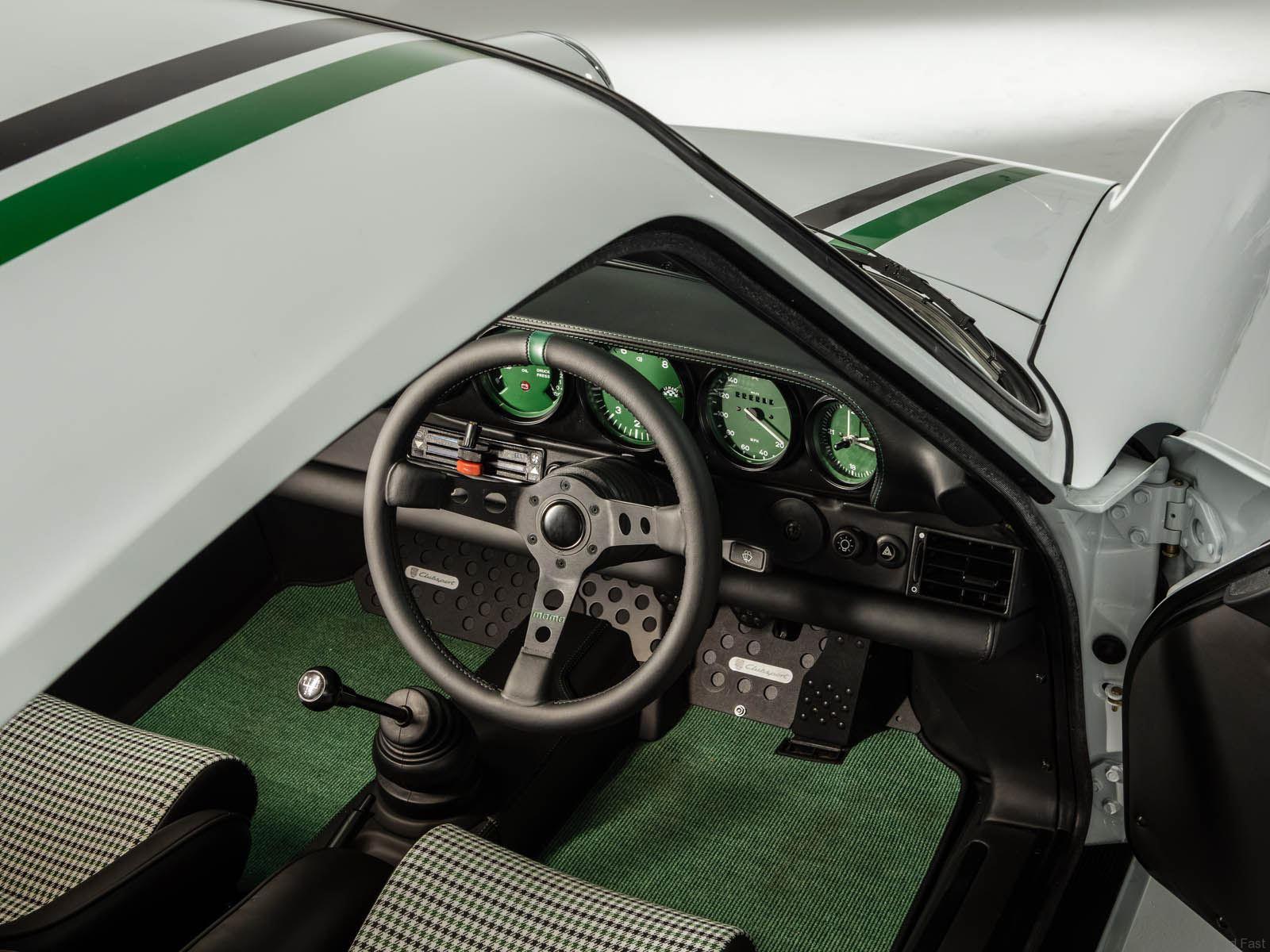 The 3.4-liter air-cooled boxer six is upgraded to 300 horsepower, with a new injection system, the plenum and camshafts from a GT3 RS, in-house programmable ECU, and lighter crankshaft, connecting rods, and flywheel. It’s mated to a Getrag G50 gearbox and limited-slip differential. Paul Stephens will offer the Le Mans Classic Clubsport in both Touring and Lightweight guises, the latter weighing as little as 970 kg in the latter spec to deliver a 0-60 time of 4.4 seconds and a top speed of 175 mph. Inside, those fortunate enough will find ST-style touring seats trimmed in black leather and houndstooth inserts, stainless steel pedals, 24-hour dashboard clock, and green floor mats, door pulls, seatbelts, and dials.