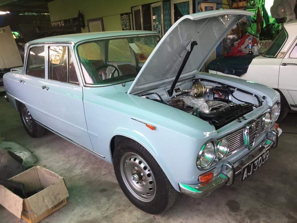 This 1967 Alfa Romeo Giulia Ti (light blue car) had undergone a 5-year nut & bolt ground up restoration in Bangkok to immaculate condition. It received its factory colour Aqua de Fonte. Most parts were replaced by hard to find NOS (new old stock) and trimmings were either replated, rechromed or refinished to ‘as new’ condition by craftsmen from Europe or Thailand. Here below are the after restoration work pictures.