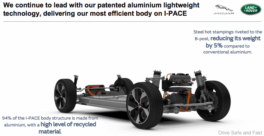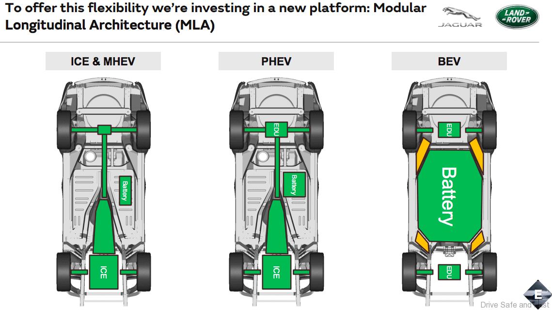 JLR’s new Modular Longitudinal Platform (MLA) will bring cost efficiencies by being shared across the bulk of its vehicles. Currently JLR uses 6 platforms, including the D7U aluminum platform used by the Range Rover, Range Rover Sport and Discovery large SUVs, and the D7A aluminum platform used by Jaguar XF and XE sedans, Jaguar F-Pace SUV and the Range Rover Velar.