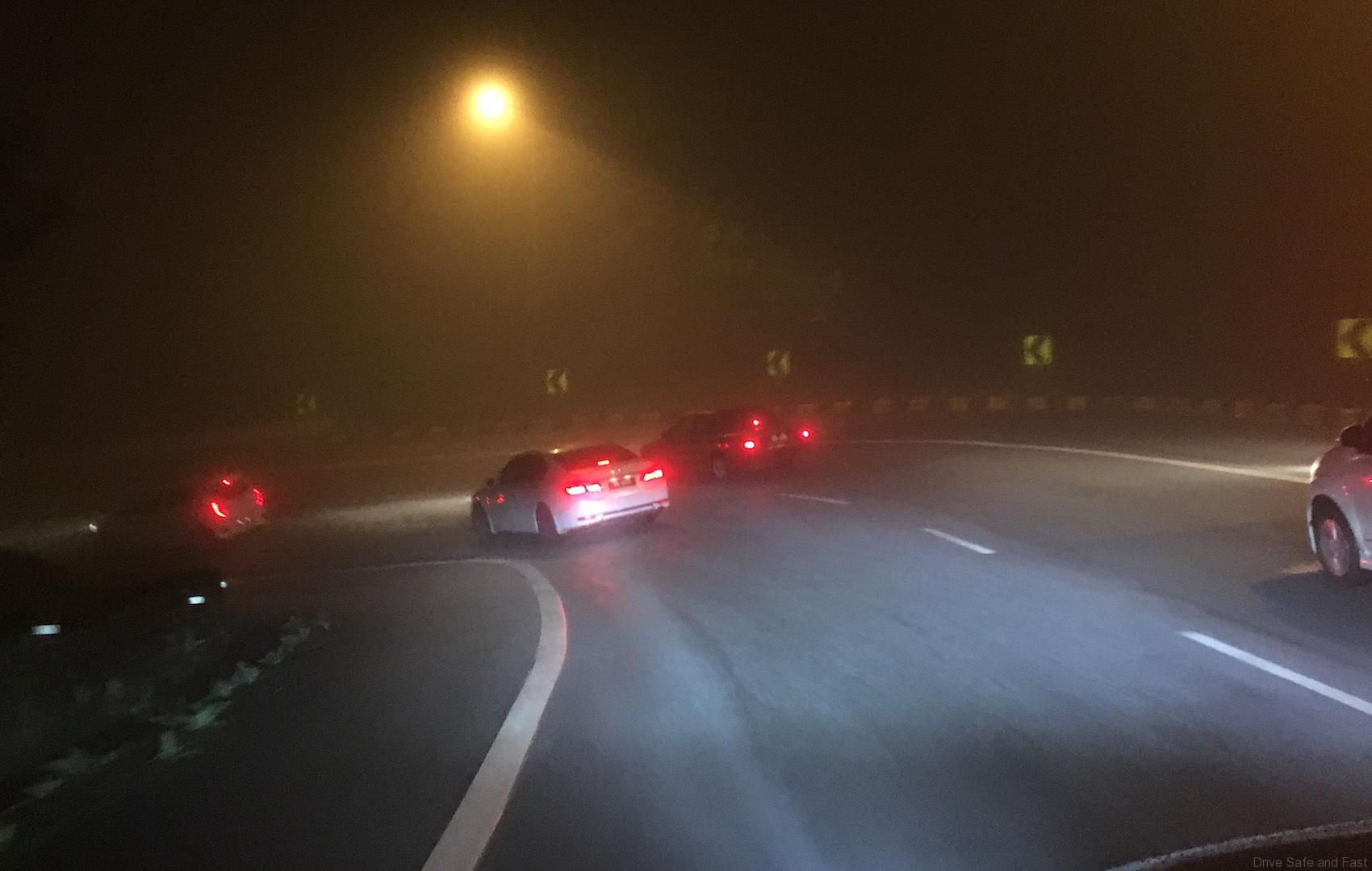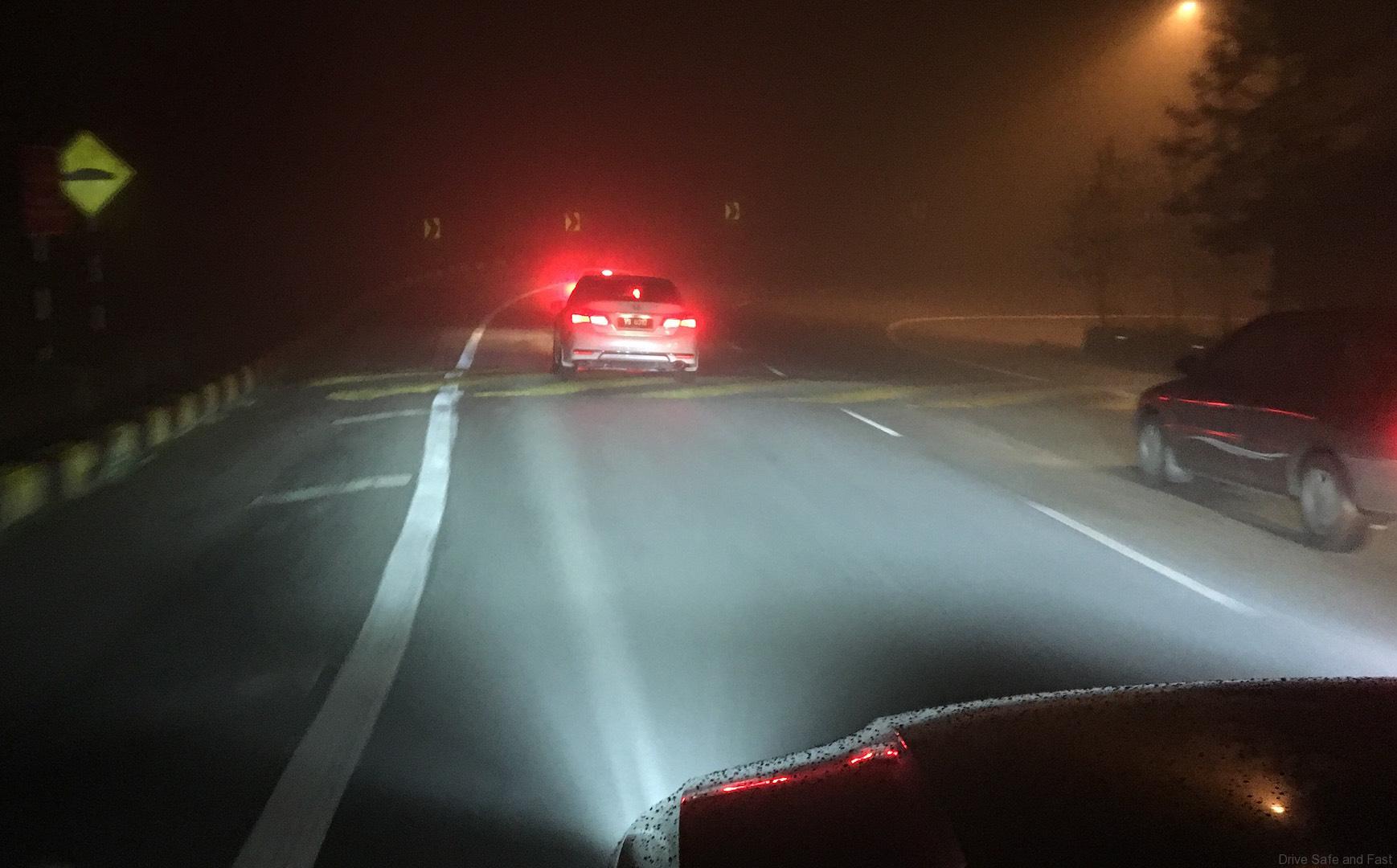 Headlights provide a clearer view ahead that allows drivers to see in times of low road visibility (like in these pictures). At night, these lights can either produce low beam, which is used when there is oncoming traffic, and high beam, which is suitable on one way roads as it gives a widely distributed light that may blind other drivers.