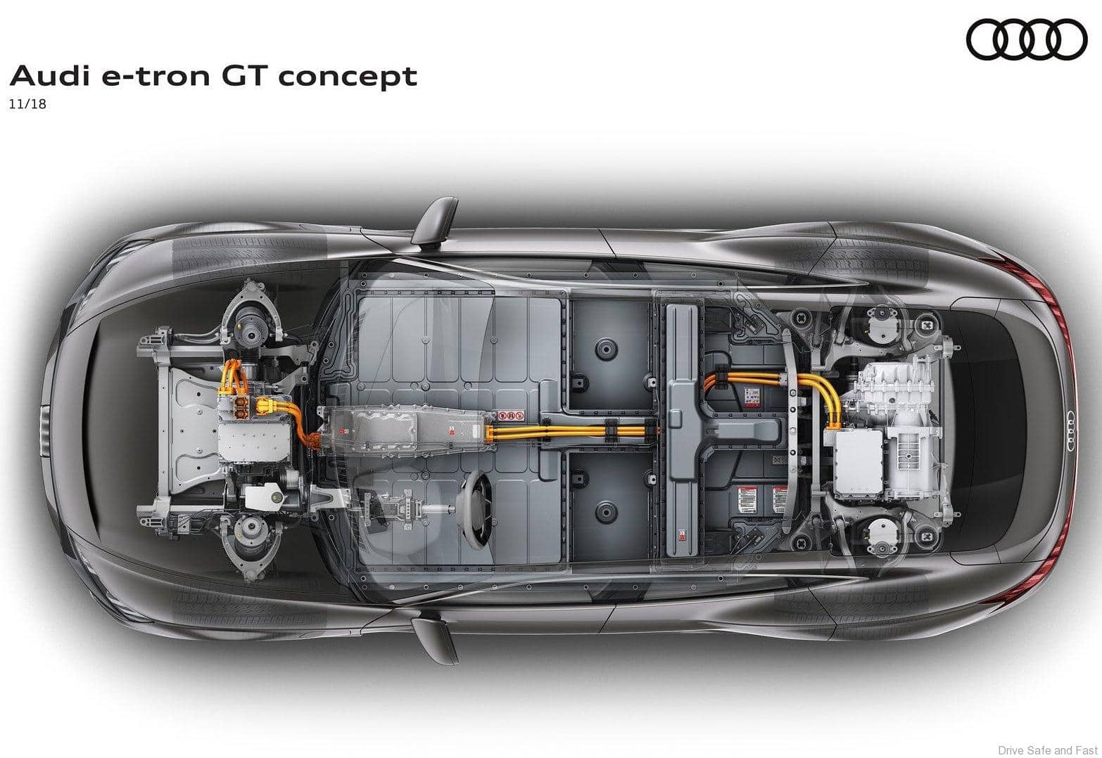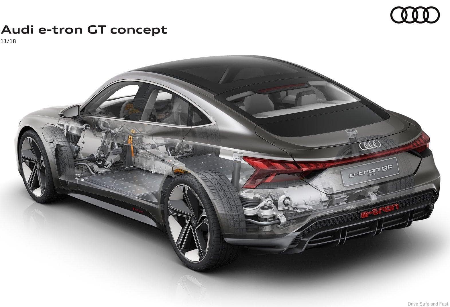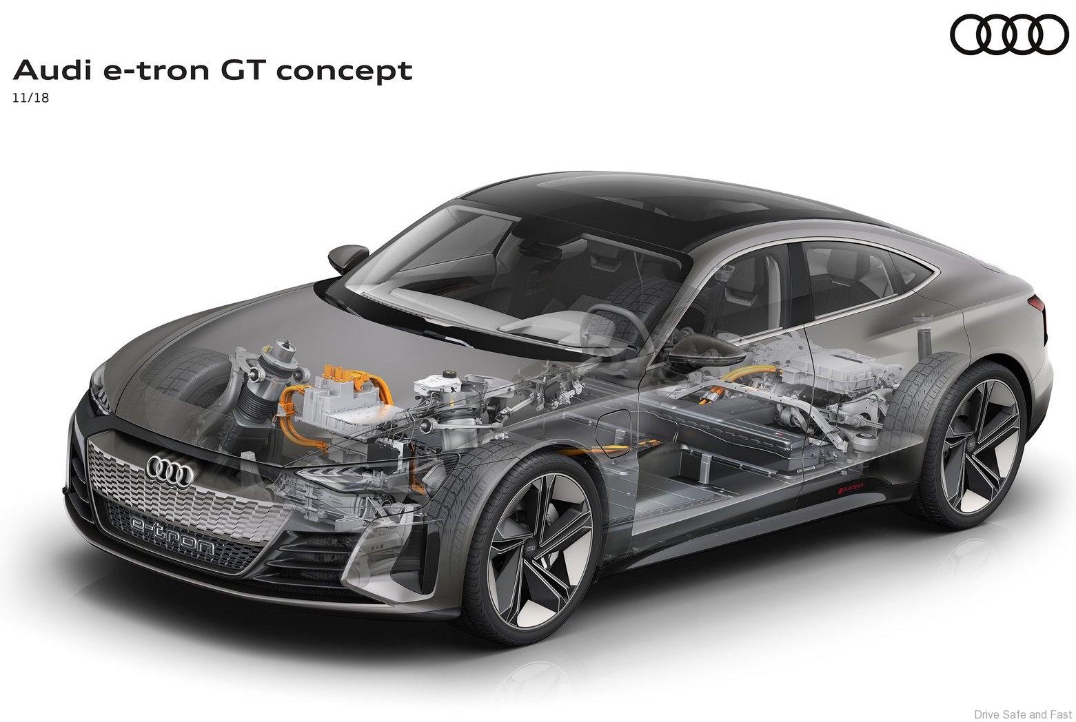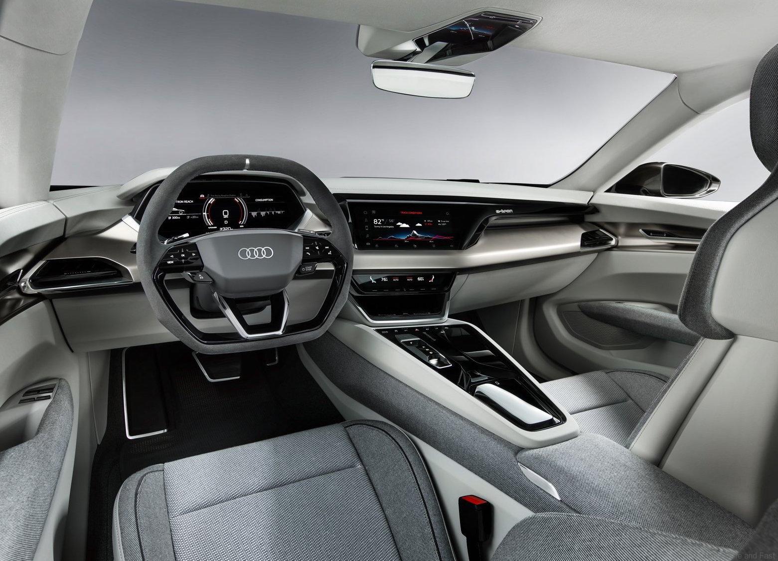 The range of the concept car will be over 400 kilometers determined according to the new WLTP standard. The required drive energy comes from a lithium-ion battery with an energy content of more than 90 kWh, which takes up the entire underfloor area between the front and rear axle with its flat design. The decisive advantage of this design is the car’s extremely low center of gravity – comparable with that of the Audi R8 – which in turn decisively benefits dynamic handling. All-wheel steering translates this into a perfect synthesis of sports car-like agility and precision, augmented by superb directional stability.