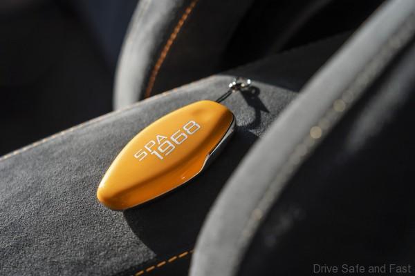 From the McLaren Special Operations (MSO) Defined range, Extended Carbon Fibre Sill Covers are inscribed with the legend “1st McLaren F1 victory Belgian Grand Prix 9th June 1968 – Bruce McLaren”. Even the ignition key has an echo of the win with each of the MSO bespoke keys painted Anniversary Orange and featuring silver “Spa 68” text.