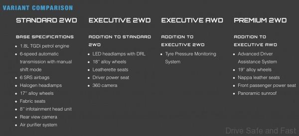 There are four variants on offer: Standard 2WD, Executive 2WD, Executive AWD, and Premium 2WD. All models come with Geely’s 1.8 turbocharged gasoline direct injection engine and are paired to a 6-speed conventional automatic.