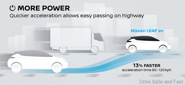 The high-capacity battery and more powerful motor in the LEAF e+ combine to produce 160 kilowatts of power and 340 Nm of torque, enabling faster acceleration when driving at high speeds. Accelerating from 80 kph to 120 kph is nearly 13% quicker. This allows the LEAF e+ to confidently pass slower-moving vehicles, exit corners faster and more seamlessly and merge easily with fast-moving traffic. The top speed has increased by approximately 10% for comfortable cruising.