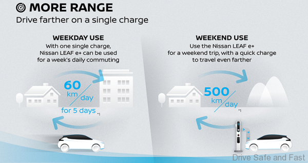 The “e+” refers to the increased energy density of the model’s battery pack and the higher output of its powertrain. The new powertrain adds to the car’s range by approximately 40%, ensuring that there’s a Nissan LEAF to meet the driving needs of a wider range of customers.
