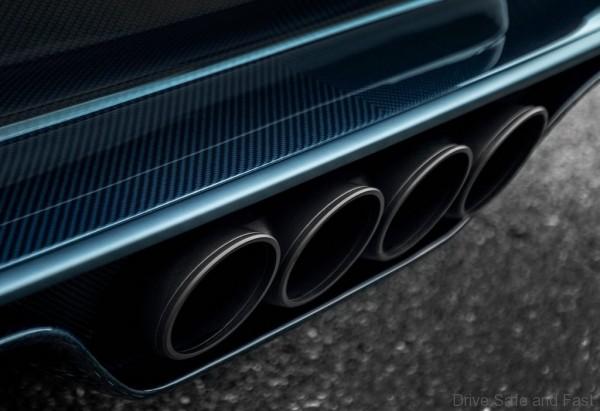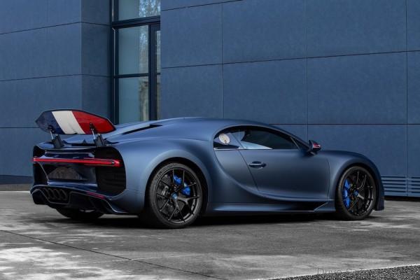The rear end is dominated by the diffuser and bumper in glossy Steel Blue Carbon with the contrasting matt black exhaust system. The underside of the rear spoiler boasts the French flag over its entire width. The rear spoiler mechanism is anodized in matt black to harmonize with the matt black Ettore Bugatti logo on the centre of the rear, the matt black wheels and the matching sports exhaust system.