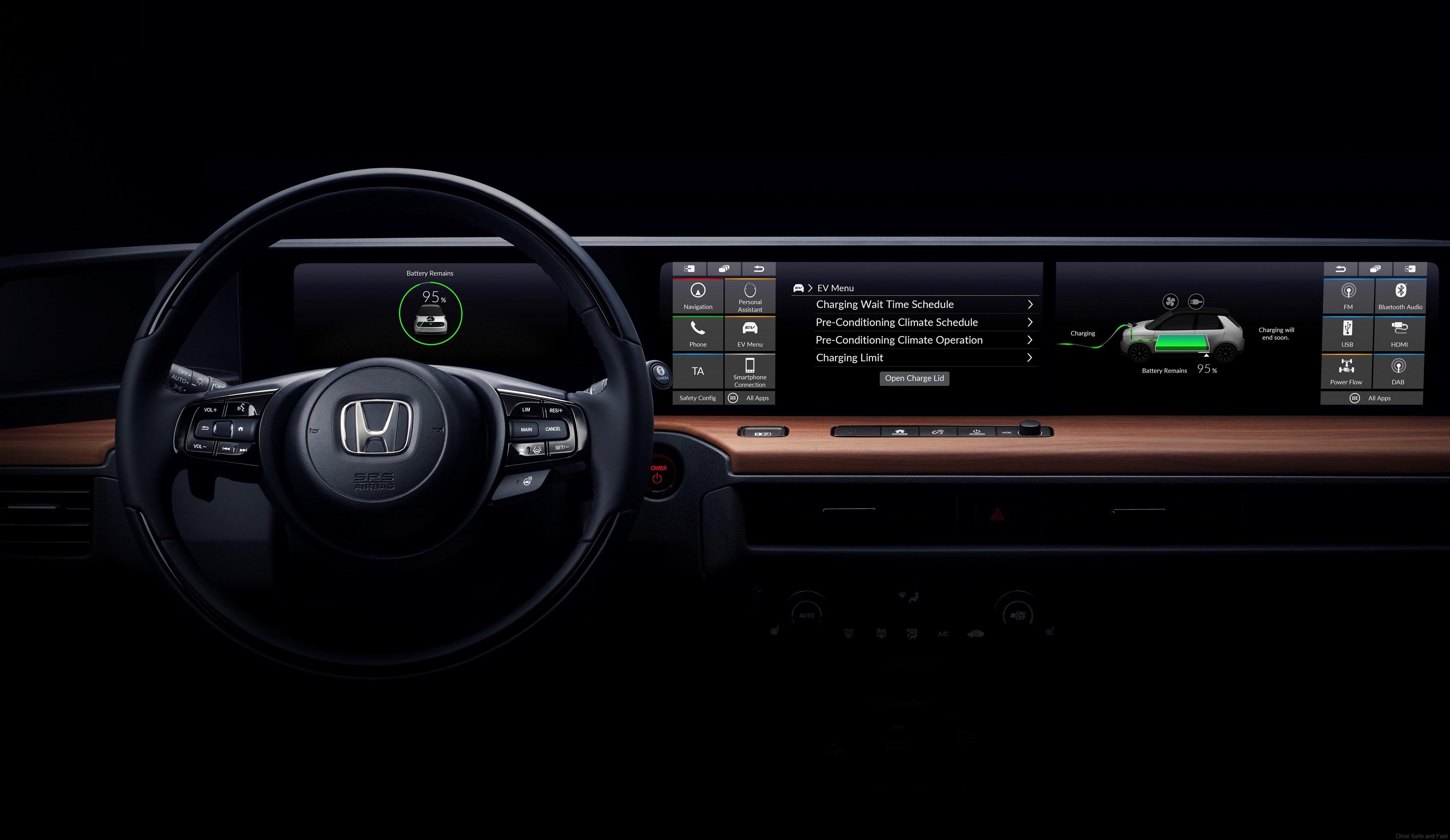 Here are the first images of the new HONDA Electric Car interior. The digital screen on the dashboard sits across the entire width, with only a few physical buttons existing. It is a clean design with intuitive, user-focused technology. The multifunction steering wheel will have commands for both electronics, multimedia and even climate control.