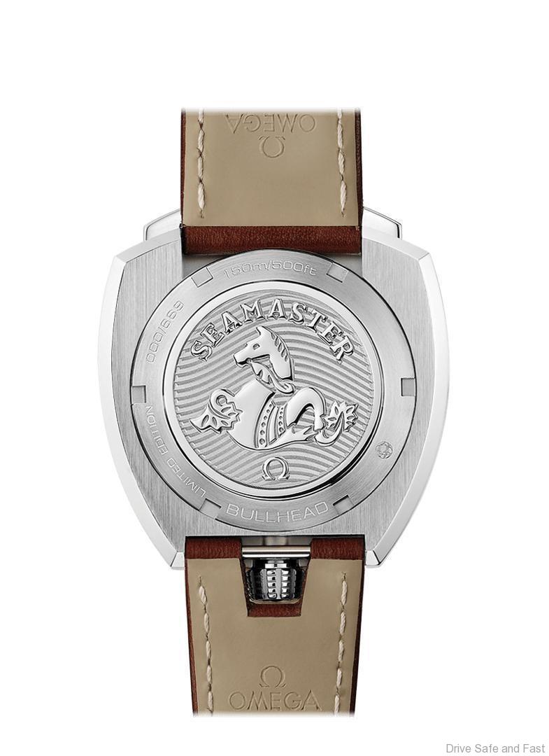 As with the original Bullhead, the date window is at 3 o’clock. The dial is visible through a sapphire crystal with anti-reflective treatment on both sides. The screw-in caseback is stamped with the familiar polished Seamaster Seahorse. The Seamaster Bullhead is water resistant to 15 bar (150 metres / 500 feet).