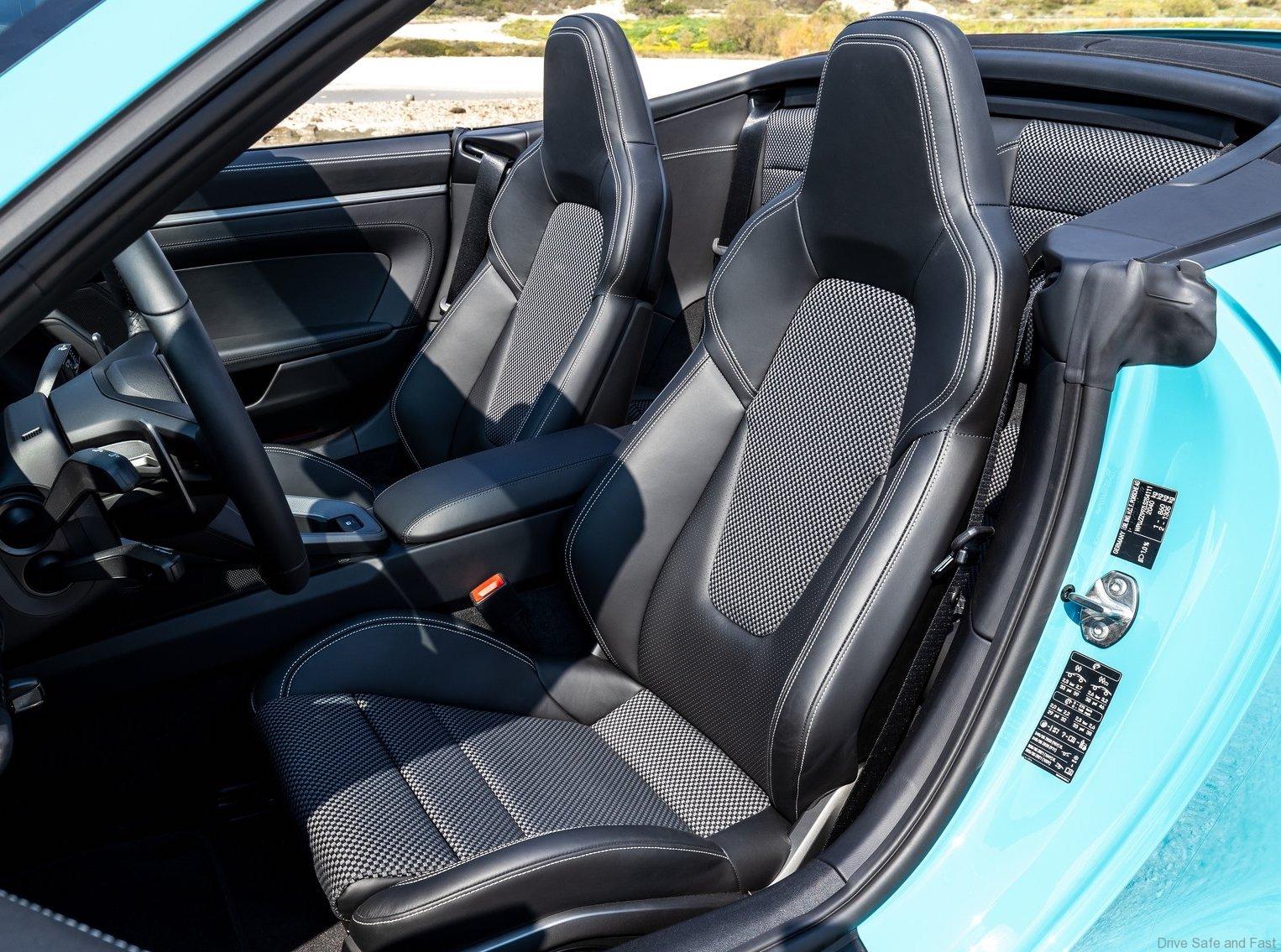 For the first time, Porsche is offering a partial leather interior in the colours Black or Slate Grey as an option for the new 911. With this option, the seat centre sections, seat bolsters and front head restraints are in smooth-finish genuine leather. The dashboard upper section and door shoulders are also covered with the same material. Like for the previous model, a full leather interior is also optionally available. The choice of additional decorative stitching, optionally in a contrasting colour, is new. The steering wheel is also provided with a contrasting seam. The leather interior is available in the colours Black, Slate Grey, Graphite Blue or Bordeaux Red.