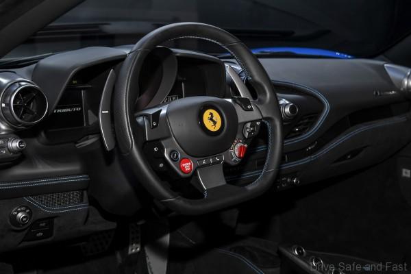 Inside, the Ferrari F8 Tributo has the familiar driver-focused cockpit but with a more modern twist.