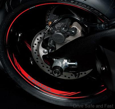 FUJICO disc brakes with breeze with putting in power controlled by the road in a controllable, effective manner is a back-torque-limiting clutch, Suzuki’s three-mode traction control system, 1 and new tires with a tubeless inner structure designed exclusively for the KATANA. front brake caliber and an Antilock Brake System (ABS) * 2 provide reliable and predictable stopping power.