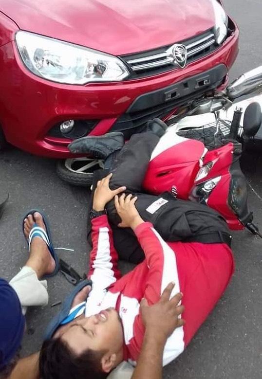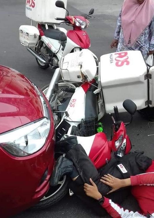 The report of this accident between a car driver who crossed a double line to enter a side street and knocked down a postman on duty comes in from Kuala Kangsar, Perak.