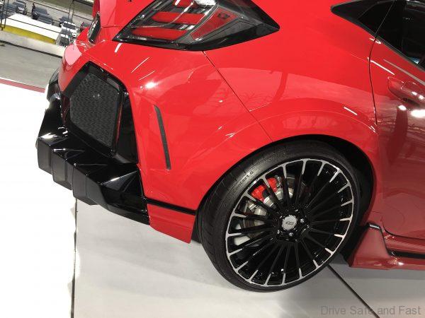 This Mugen kit on the Type R has a deeper set of front and rear bumpers and side skirts as compared to the stock car. The rear bumper features an aggressive extended diffuser and with the colour combination it looks very aggressive.