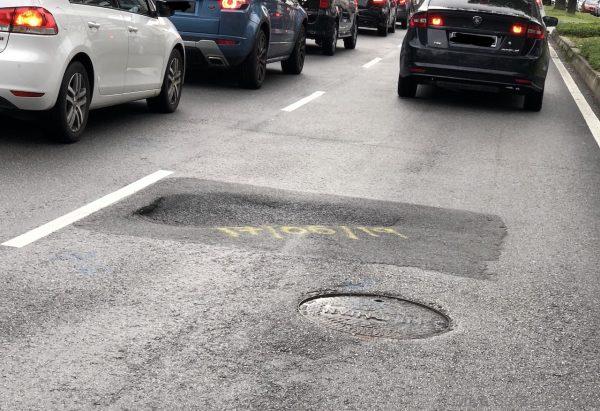 About a month ago there was some heavy road works right in front of the Renault showroom in Petaling Jaya, next to Plaza 33. The contractor resurfaced the road after that with little effort. The MBPJ officer assigned to the project obviously gave the green-light to the work done and then last Saturday (the 15th) really early in the morning as we drove along this frequented road our car hit this wide and deep pothole. We were lucky as we did not hit it right smack centre but the car behind us did and we could hear the wheel and suspension of his car feeling the pain.