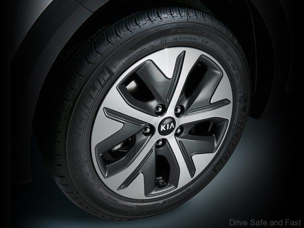 The Niro EV’s futuristic and aerodynamic ‘tiger-nose’ grille features an integrated charging port, bearing a ‘de-bossed’ Niro logo. Redesigned air intakes and new arrowhead-shaped LED daytime running lights combine with light-blue trim highlights to emphasise the car’s sleek profile along with its slim character line and tapered rear windows. The Niro EV rides on new five-spoke 17-inch aluminium alloy wheels with a diamond-cut two-tone finish, housing Kia’s regenerative braking system.