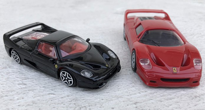 · 2007 Ferrari is 1/38 scale and 2019 Ferrari is 1/43 scale which makes the 2019 Ferrari smaller in size.