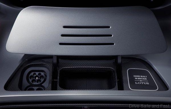 The directional indicators are incorporated into the corners of the ribbon, while the reversing light is provided by the illuminated ‘T’ of the ‘LOTUS’ wordmark above the integrated charging flap.