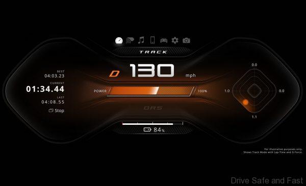 The Evija’s infotainment system includes a chronograph to allow the driver to record their lap times. Connection to the cloud means they can view their performance while at the track and recall previous sessions through the app.