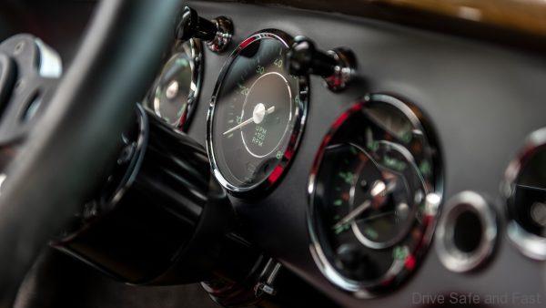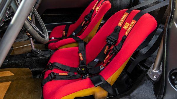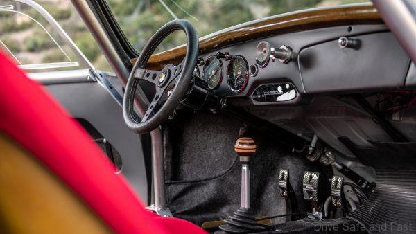 And the details don’t stop there. The pedal boards, air intakes and dashboard are all formed from amber fibreglass, like in a 917, there’s a knurled boost control knob from a 935 located to the right of period correct dials, while the custom made bucket seats feature a Nomex style fabric, similar in aesthetic to that of the material used in the original 908.