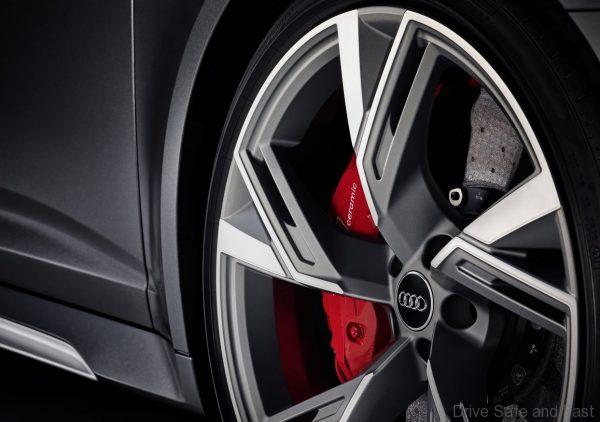 The new RS6 Avant is fitted standard with 21-inch cast aluminium wheels in 10-spoke star design, which are shod with 275/35 size tyres. An RS-specific wheel in 22-inch 5-V-spoke trapezoid design with 285/30 tires will be available on the Vorsprung specification. The newly developed RS ceramic brake system weighs around 34 kilograms less than its steel counterpart, thus reducing unsprung masses. The Electronic Stabilisation Control (ESC) features a sport mode or can be switched off entirely.